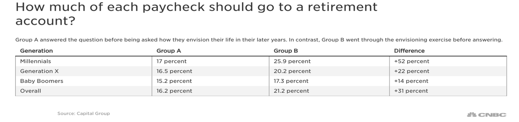 A new survey from Capital Group, cited by CNBC, found that when employees visualized their ideal retirement, they actually recommended saving more for retirement per paycheck than those who didn’t give much thought to their post-career life. The following chart shows the results of Capital Group’s “hidden experiment” in which they asked two groups of people how much of their paycheck they thought they should save for retirement.